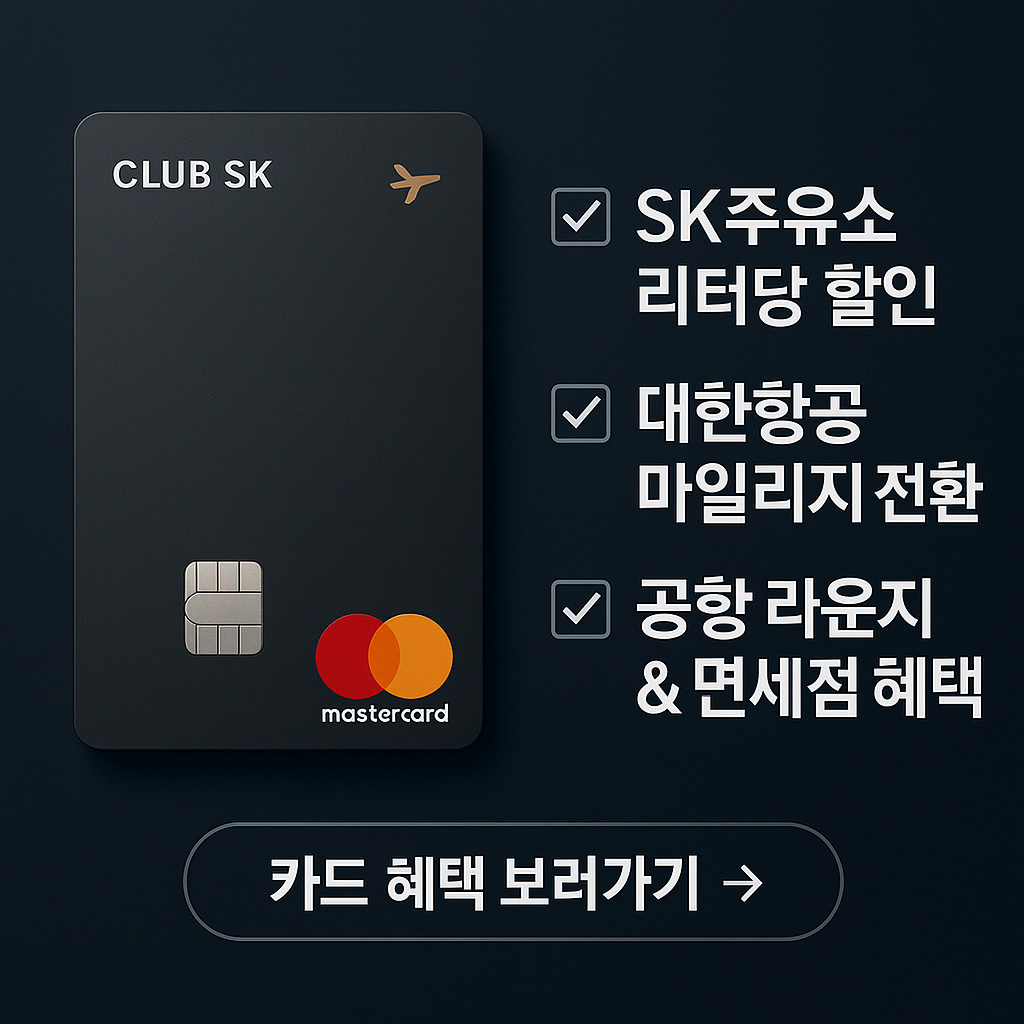 CLUB SK 카드는 단순한 여행용 카드도, 단순한 주유 카드도 아닙니다. 대한항공 마일리지 전환이 가능한 항공 특화 기능에, **SK주유소 리터당 할인까지 겸비한 ‘올인원 운전자 카드’**죠. 매달 꾸준한 소비만으로도 ✈️ 여행 준비는 마일리지로, ⛽ 출퇴근 유류비는 청구할인으로 이중 절약을 실현할 수 있습니다. “마일리지 적립도 하고, 기름값도 아끼고 싶다” 그렇다면 지금이 CLUB SK 카드를 시작할 가장 좋은 시점입니다.
