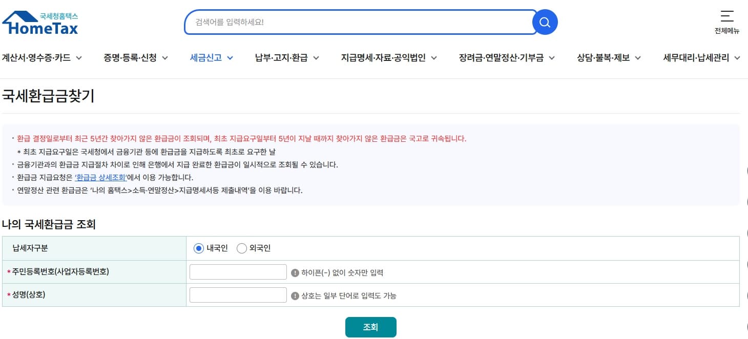 국세환급금찾기 란에서 개인정보를 입력해주시면 하단에 결과가 나옵니다.