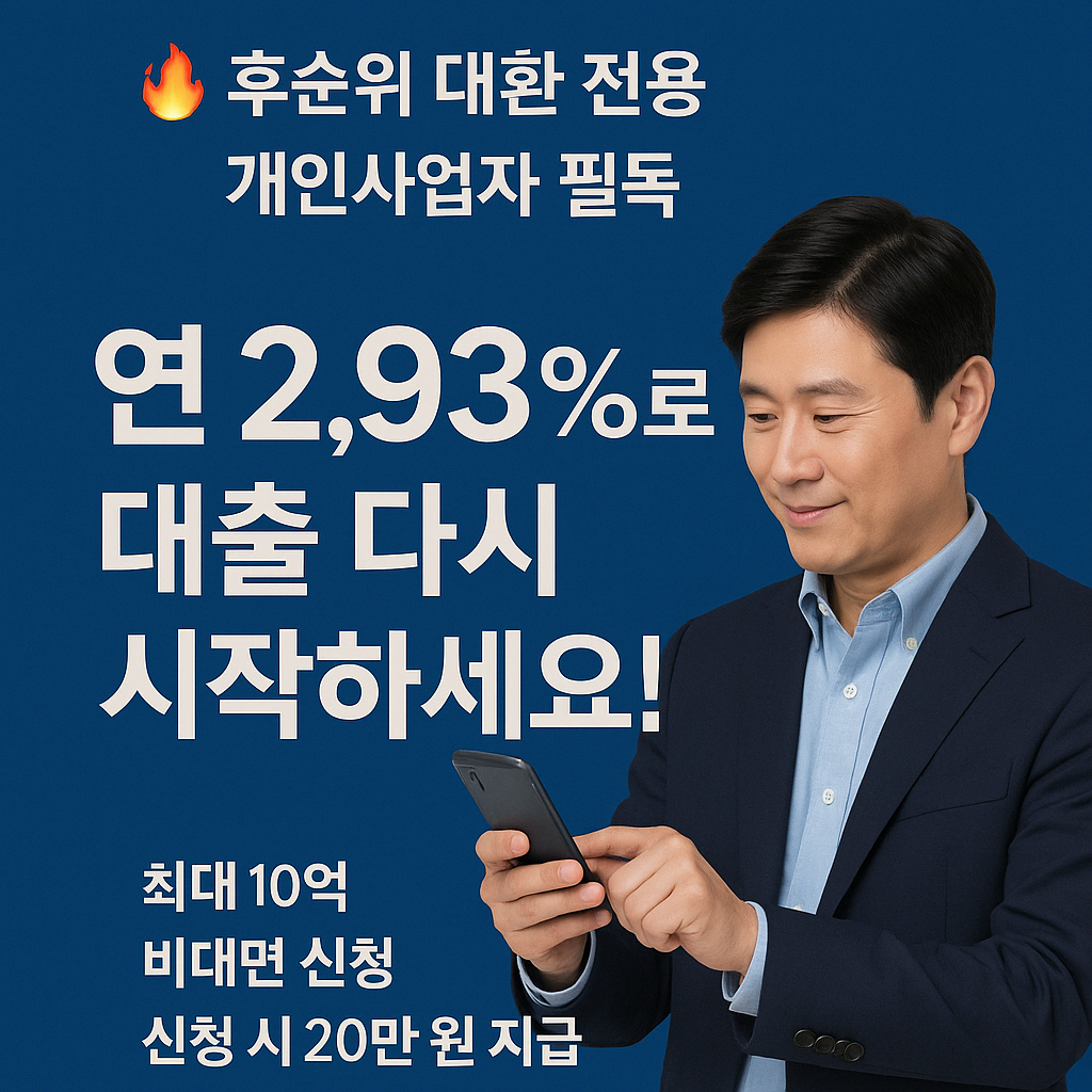 고금리 대출로 인해 매달 부담이 크셨던 개인사업자분들께, 이번 케이뱅크의 후순위 부동산담보 대환대출 상품은 분명한 해결책이 될 수 있습니다. 연 2.93% 금리, 20만 원 지원금, 비대면 3일 신청 완료 지금이 바로 갈아탈 타이밍입니다.